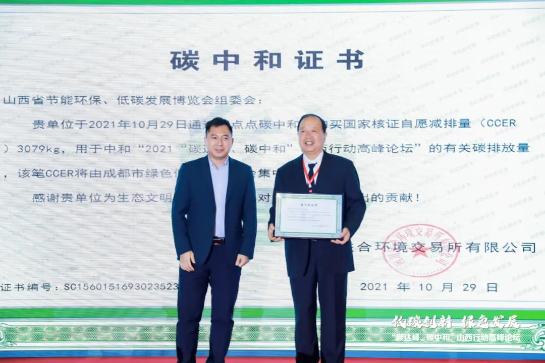 經(jīng)相關(guān)方面核算,預(yù)估本次論壇的總排放量為3.079噸二氧化碳當(dāng)量。根據(jù)本次論壇的排放情況,將本次會議執(zhí)行過程中產(chǎn)生的二氧化碳排放量,通過購買 CCER實現(xiàn)了碳減排的抵消。在現(xiàn)場,祥睿能源授予大會組委會《碳中和證書》,由省節(jié)能協(xié)會會長藺建國代表組委會領(lǐng)取了該項證書。