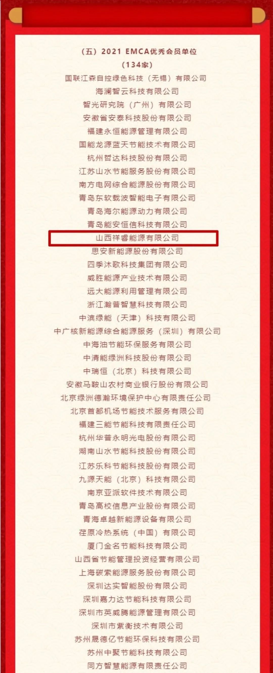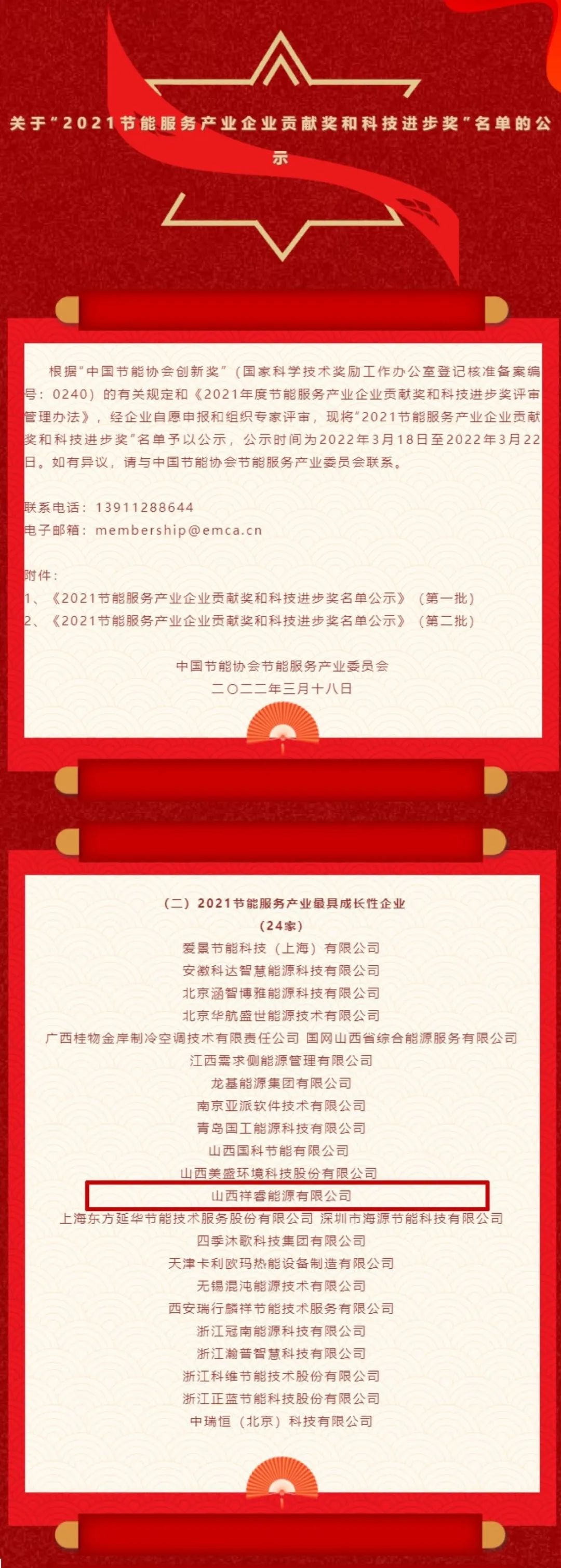 3月18日,中國節(jié)能協(xié)會(huì)節(jié)能服務(wù)產(chǎn)業(yè)委員會(huì)發(fā)布了關(guān)于《2021節(jié)能服務(wù)產(chǎn)業(yè)企業(yè)貢獻(xiàn)獎(jiǎng)和科技進(jìn)步獎(jiǎng)名單的公示》。山西祥睿能源有限公司榮登榜單,入選“2021年節(jié)能服務(wù)產(chǎn)業(yè)最具成長性企業(yè)”和“2021EMCA優(yōu)秀會(huì)員單位”稱號(hào)。