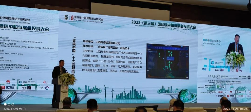 11月8日,在上海舉行的第五屆中國國際進(jìn)口博覽會上,2022(第三屆)國際碳中和與綠色投資大會暨零碳中國城市峰會隆重舉辦,“零碳中國”成果重磅發(fā)布,祥睿能源的“虛擬電廠源荷互動技術(shù)” 榮登“2022年度‘零碳中國’十大創(chuàng)新技術(shù)”榜,總工程師孫大偉出席大會并發(fā)表《虛擬電廠與零碳交通》的演講。