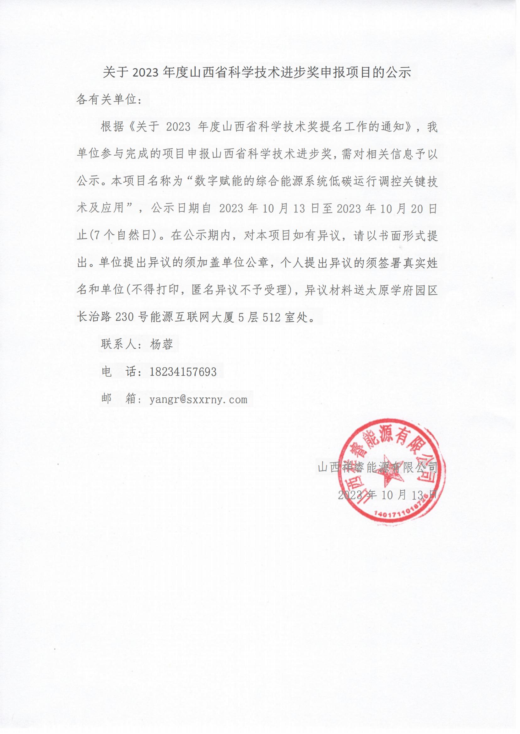 | 關于2023年度山西省科學技術進步獎申報項目的公示 |