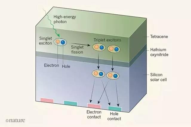 在太陽(yáng)能電池中,光子激發(fā)材料分子釋放電子,產(chǎn)生電流。通常一個(gè)光子只能激發(fā)出一個(gè)電子,高能光子的剩余能量會(huì)以熱量的形式散失。 此前人們發(fā)現(xiàn),在并四苯等某些有機(jī)材料里,一個(gè)分子吸收一個(gè)高能光子后,可將部分能量轉(zhuǎn)移給另一個(gè)分子,最終產(chǎn)生兩個(gè)電子,這種現(xiàn)象稱(chēng)為“單線(xiàn)態(tài)激子裂變”。理論上,在硅電池上覆蓋一層并四苯,就能用一個(gè)高能光子獲得兩個(gè)電子,但如何讓“單線(xiàn)態(tài)激子裂變”產(chǎn)生的兩個(gè)電子轉(zhuǎn)移到硅材料中是一個(gè)關(guān)鍵難題。 為了保證電池效率和耐久性,硅材料必須有表面鈍化層。并四苯中產(chǎn)生的電子必須穿過(guò)鈍化層,才能到達(dá)硅材料。相對(duì)于電子轉(zhuǎn)移能力來(lái)說(shuō),目前的鈍化層都太厚了。 新方案的關(guān)鍵是用氮氧化鉿對(duì)硅材料進(jìn)行鈍化,得到的鈍化層厚度僅0.8納米(1納米等于十億分之一米),可容許更多電子通過(guò)。研究表明,并四苯每吸收一個(gè)光子,平均有1.3個(gè)電子可穿過(guò)氮氧化鉿鈍化層,轉(zhuǎn)移到硅材料里。研究人員說(shuō),新電池效率遠(yuǎn)未達(dá)到理論極限,尚需改進(jìn),但試驗(yàn)證明了其中的關(guān)鍵步驟行之有效。該方案沒(méi)有引入復(fù)雜的設(shè)計(jì),而且可能使電池總體上更薄。 |