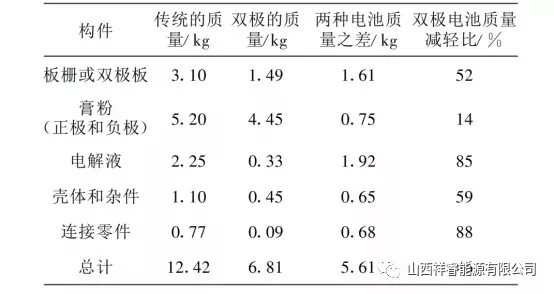 目前,除了動力鋰電池外,我國動力蓄電池的需求量增長也很明朗。隨著電動汽車的發(fā)展,與其配套的鉛酸蓄電池也得到了相應的發(fā)展。蓄電池的使用壽命是制約著電動汽車發(fā)展的重要因素之一,所以,提高鉛蓄電池的使用壽命至關重要。影響鉛酸蓄電池使用壽命的因素主要包括,與之相配套的充電器、自身質量、用戶使用方式是否正確等。 提高蓄電池質量,可以從鉛膏及固化入手,鉛膏添加劑是從事鉛酸電池研究的人員長期研究的內容之一,鉛膏主要作用是改善正極的導電性能,增加正極的孔率,改善負極充電接受能力和防止極板的硫鹽化。多數充電器在指示燈變燈指示充滿電以后,電池充入電量可能是97%~99%。雖然僅欠充電1%~3%的電量,對續(xù)行能力的影響幾乎可以忽略,但是也會形成欠充電積,所以電池充滿電變燈以后還是盡可能繼續(xù)進行浮充電,這樣對抑制電池硫化也是有好處的。 目前,除了動力鋰電池外,我國動力蓄電池的需求量增長也很明朗。電動汽車所用的動力鉛酸蓄電池種類多樣化,包括雙極性鉛酸蓄電池、水平鉛酸蓄電池,以及卷式電池等。雙極性密封鉛酸蓄電池最早是由美國Arias公司開發(fā)的,是一面有正極活性物質,另一面有負極活性物質的堅實薄片極板的電池,具有較高的比能量。 普通鉛酸電池的極板是豎立著放置的,而雙極性鉛酸蓄電池的電極是平臥著放置的。電極水平臥著放置是為了防止電解液層化,和活性物質剝離,以及便于采用輕量薄形電極基片。通過采用雙極性結構,大大減輕了鉛酸電池的質量,提高了設計效率。如表1,是對傳統(tǒng)的12V12Ah鉛酸電池與雙極性24V12Ah鉛酸電池零件分解質量的比較。