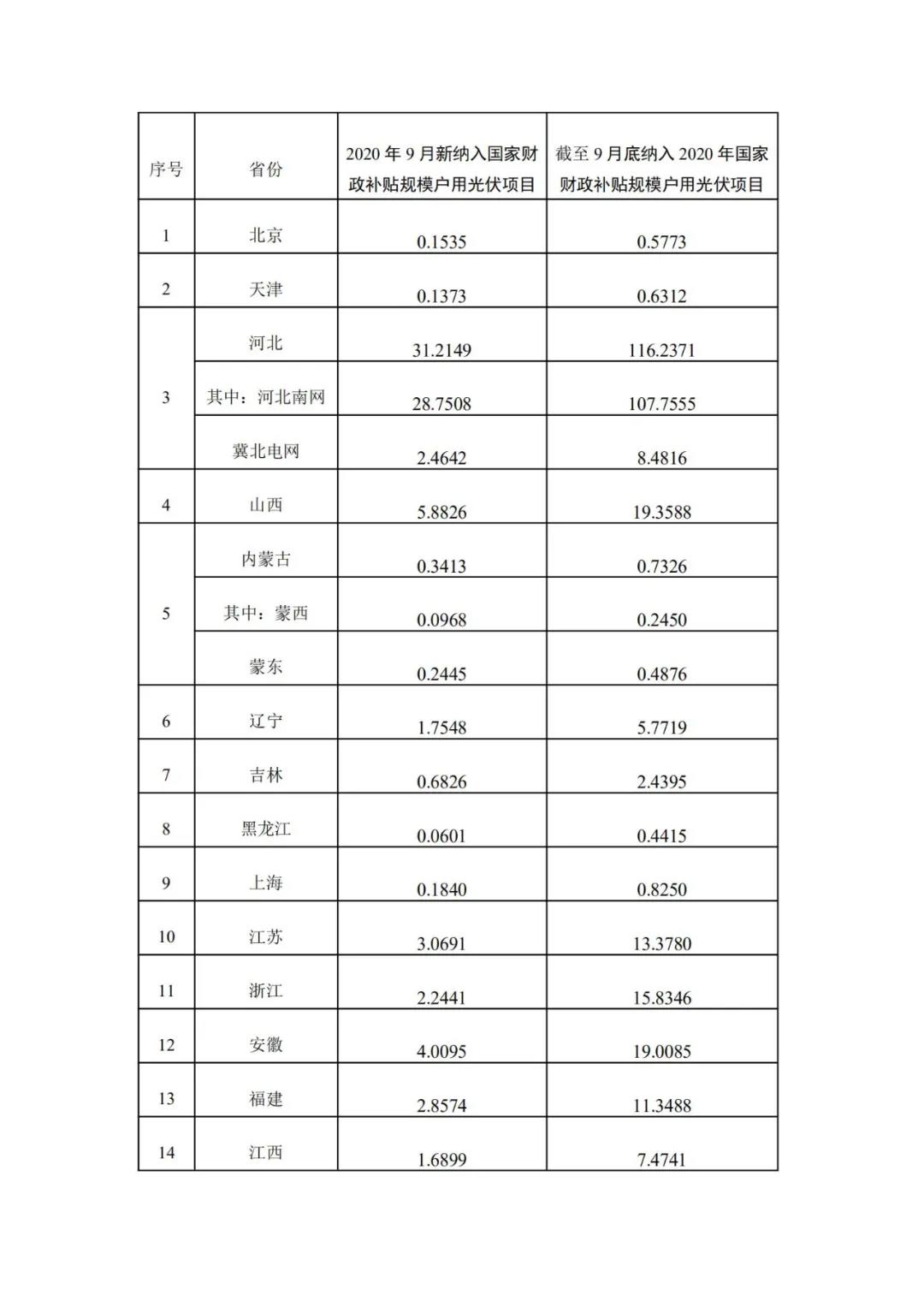 按照《國(guó)家能源局關(guān)于2020年風(fēng)電、光伏發(fā)電項(xiàng)目建設(shè)有關(guān)事項(xiàng)的通知》(國(guó)能發(fā)新能〔2020〕17號(hào))和《國(guó)家能源局綜合司關(guān)于2019年戶(hù)用光伏項(xiàng)目信息公布和報(bào)送有關(guān)事項(xiàng)的通知》(國(guó)能綜通新能〔2019〕45號(hào))關(guān)于戶(hù)用光伏項(xiàng)目管理有關(guān)要求,全國(guó)共有30個(gè)省份報(bào)送了戶(hù)用光伏項(xiàng)目信息(西藏?zé)o納入2020年財(cái)政補(bǔ)貼規(guī)模戶(hù)用光伏項(xiàng)目,未報(bào)送)。 根據(jù)各省級(jí)能源主管部門(mén)、電網(wǎng)企業(yè)報(bào)送信息,經(jīng)國(guó)家可再生能源信息管理中心梳理統(tǒng)計(jì),2020年9月新納入國(guó)家財(cái)政補(bǔ)貼規(guī)模戶(hù)用光伏項(xiàng)目總裝機(jī)容量為130.1萬(wàn)千瓦。截至2020年9月底,全國(guó)累計(jì)納入2020年國(guó)家財(cái)政補(bǔ)貼規(guī)模戶(hù)用光伏項(xiàng)目裝機(jī)容量為527.4萬(wàn)千瓦。詳細(xì)情況見(jiàn)附表。 附表:納入2020年國(guó)家財(cái)政補(bǔ)貼規(guī)模戶(hù)用光伏項(xiàng)目裝機(jī) 容量統(tǒng)計(jì)表(截至2020年9月30日) 附表 納入2020年國(guó)家財(cái)政補(bǔ)貼規(guī)模戶(hù)用光伏項(xiàng)目 裝機(jī)容量統(tǒng)計(jì)表 (截至2020年9月30日)